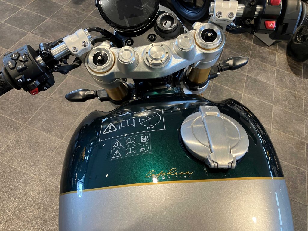 低いクリップオンバー、シートカウル付きのブレットシート等カフェレーサーらしいたたずまいに、限定カラーのシルバーとグリーンが施された車両です。